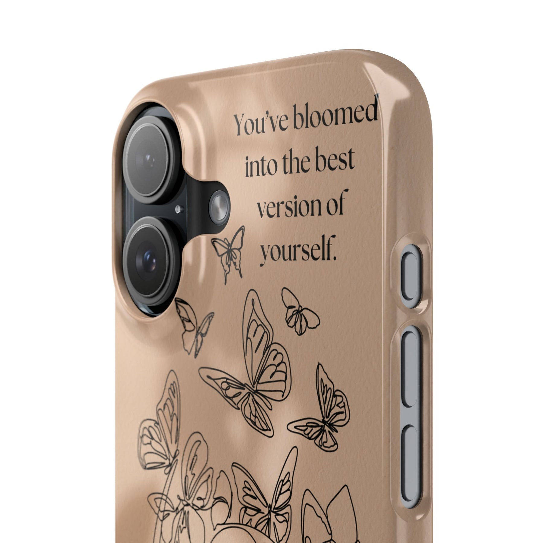 A slim, artful phone case that feels like a quiet encouragement in your pocket. Soft beige tones and a continuous wraparound line illustration of a face blooming into butterflies gives the case an intimate, hand-drawn look. The message at the top — “You’ve bloomed into the best version of yourself.” — reads like a private reminder, while the vibrant, high-density print keeps every fine line and wing crisp. Lightweight and barely-there on the phone, it supports wireless charging and resists scratches and chips, so the design ages gracefully with you. Slip it on to carry a subtle, everyday reminder of growth and calm wherever you go.