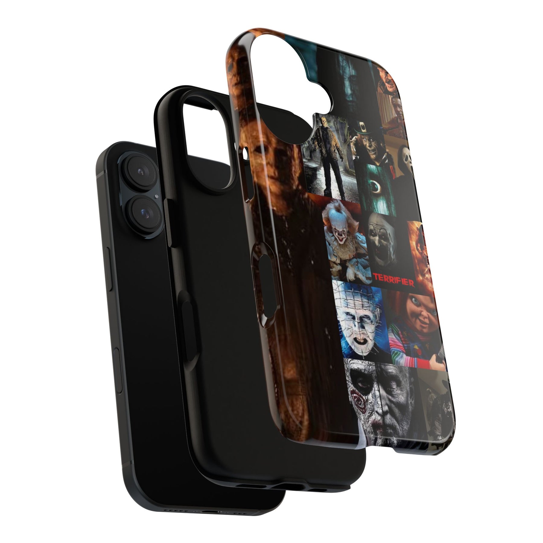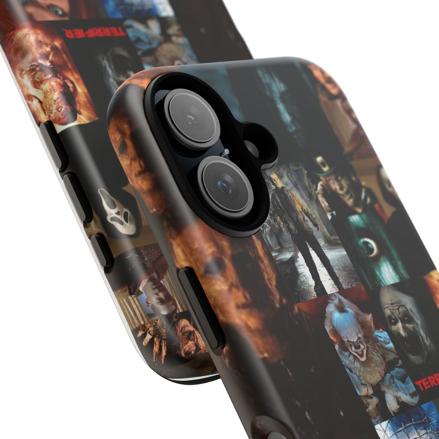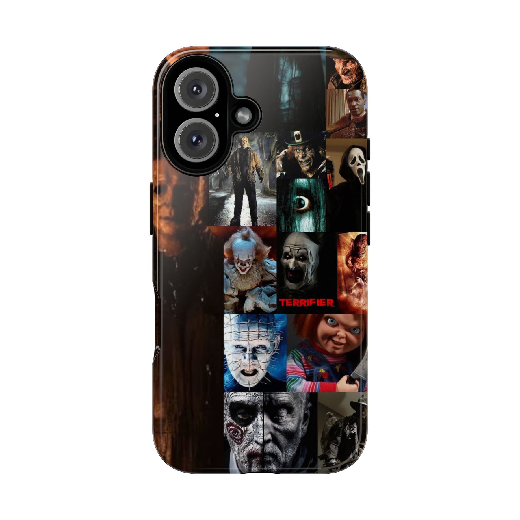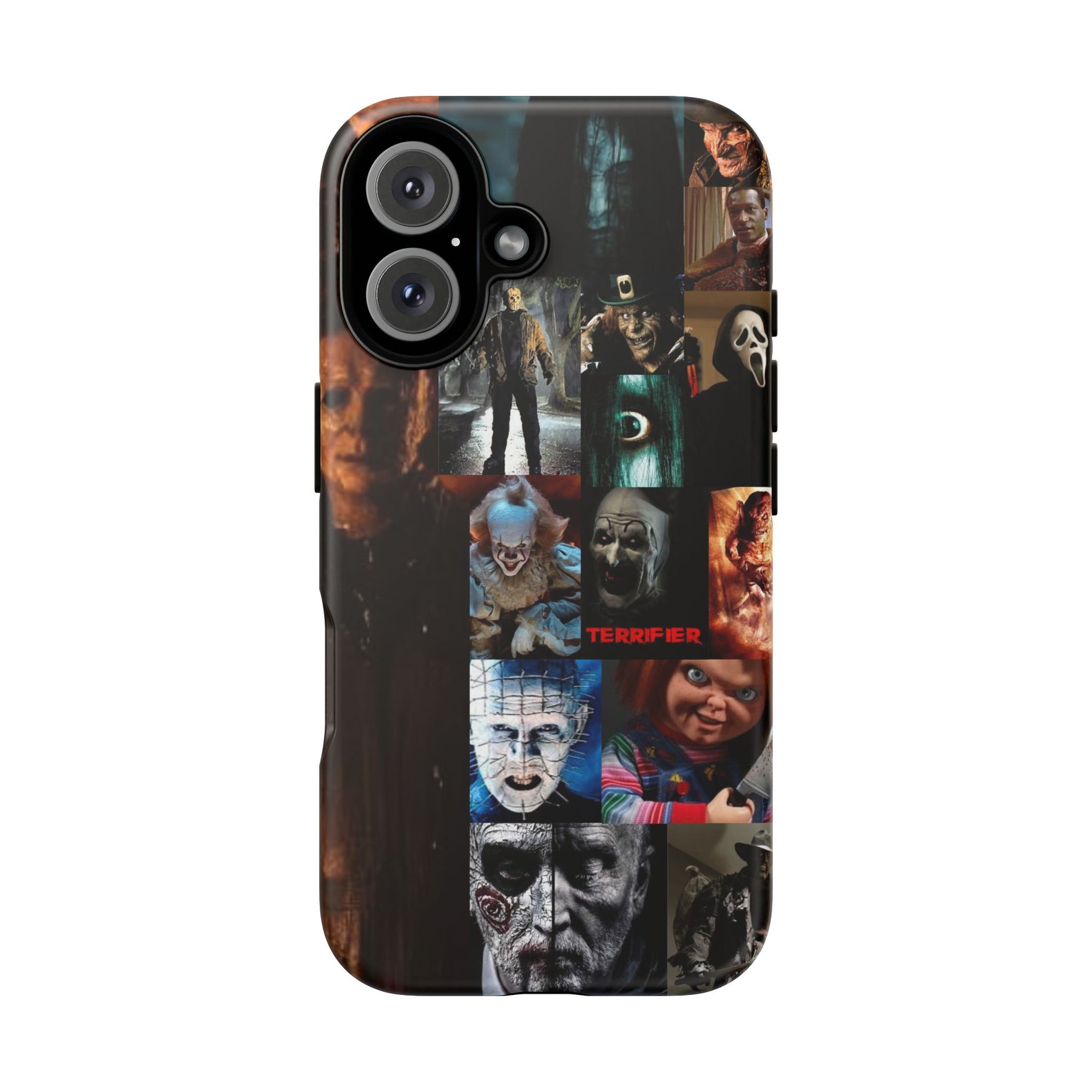 A rugged phone case that carries a dark, cinematic mood—perfect for anyone who collects horror iconography. The dual-layer shell combines a glossy/ matte printed exterior with a soft TPU silicone liner for secure grip and impact absorption. Full 3D wrap printing gives the collage of horror characters depth and rich color, while UV protection keeps the artwork vivid through outdoor use. Slim enough to support wireless charging and keep ports open, this case blends protective performance with a bold, spooky aesthetic that slips naturally into everyday carry.